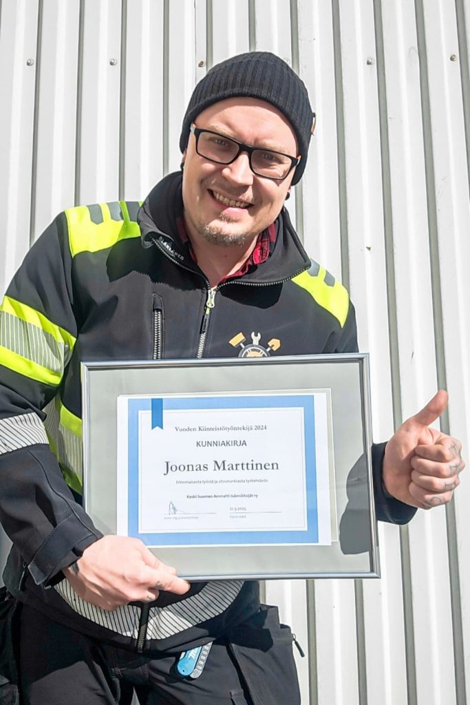 Työntekijämme Joonas Marttinen on palkittiin ansaitusti Keski-Suomen vuoden 2024 kiinteistötyöntekijänä. Tunnustuksen tarkoituksena on nostaa esille ammattitaitoisia ja arvostettuja tekijöitä kiinteistönhuollon työkentässä.